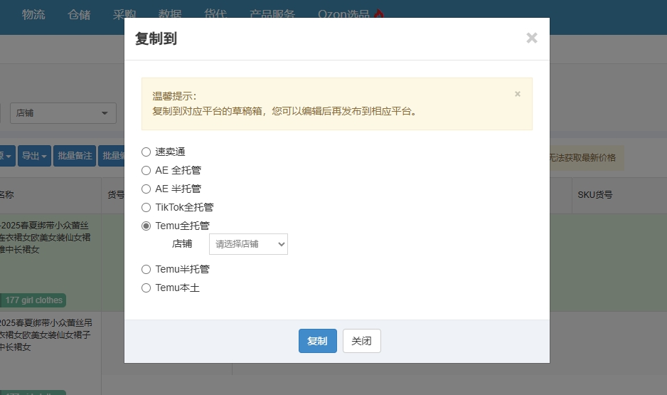 芒果店长内置产品「复制」功能,支持多平台全托管模式间产品轻松互搬。