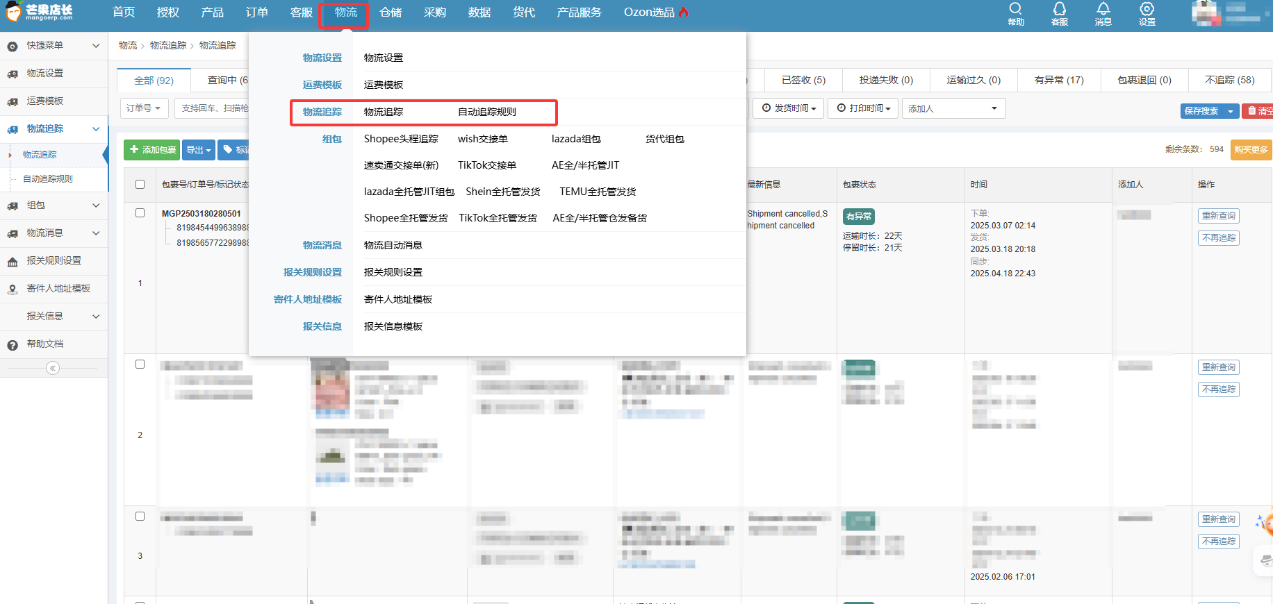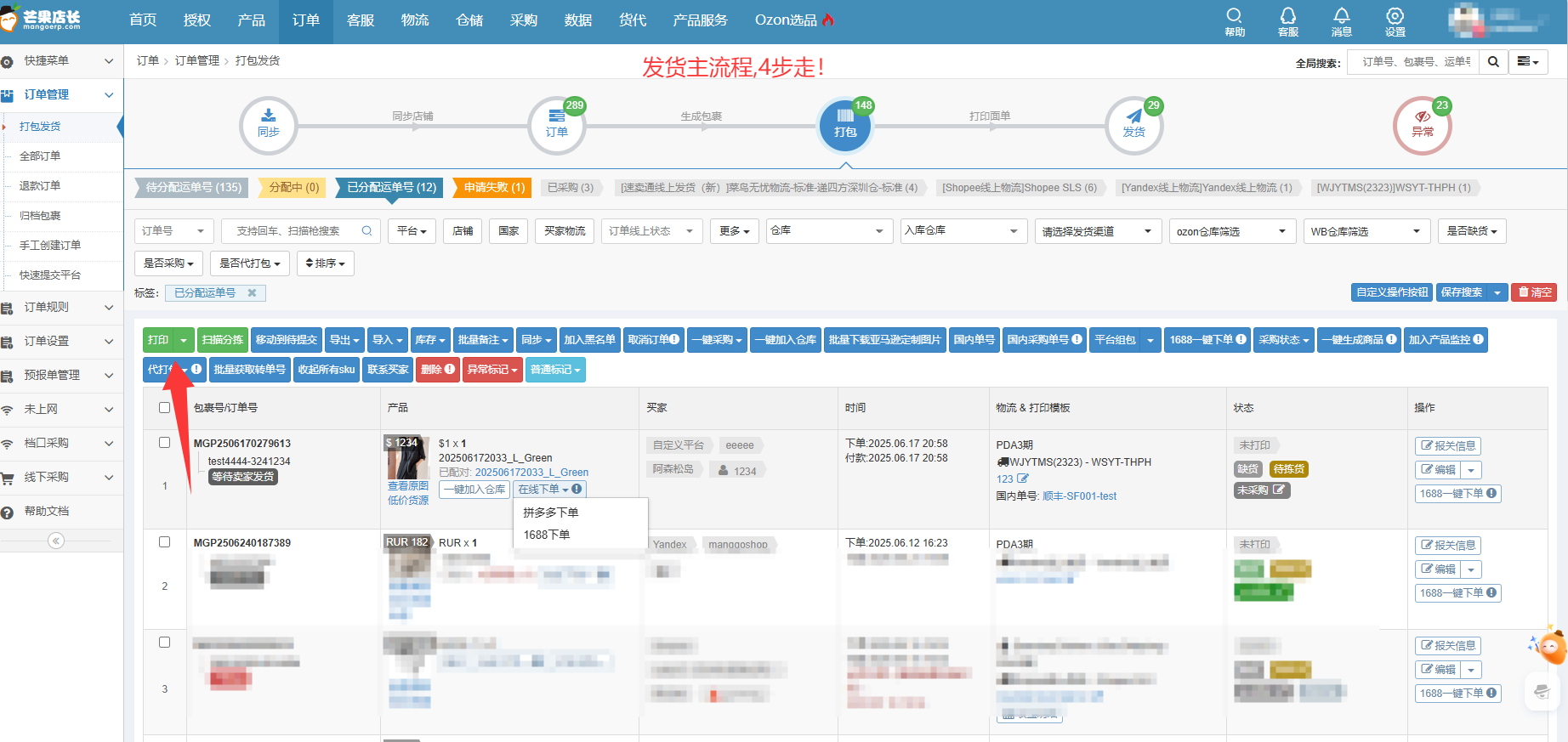 收到订单后,在芒果店长同步订单、打印面单、回传物流信息到平台。
