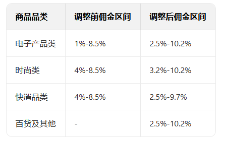 - 调整范围:全品类商城卖家佣金,部分品类涨幅显著,具体如下: